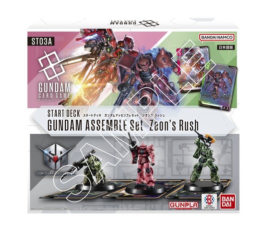スタートデッキ Zeon’s Rush [ST03]ジオンの「ザクII(シャア・アズナブル機)」とネオ・ジオンの「シナンジュ」が時代を超えてともに戦う、軽量のユニットを多数展開して戦っていく赤と緑の2色のデッキ。