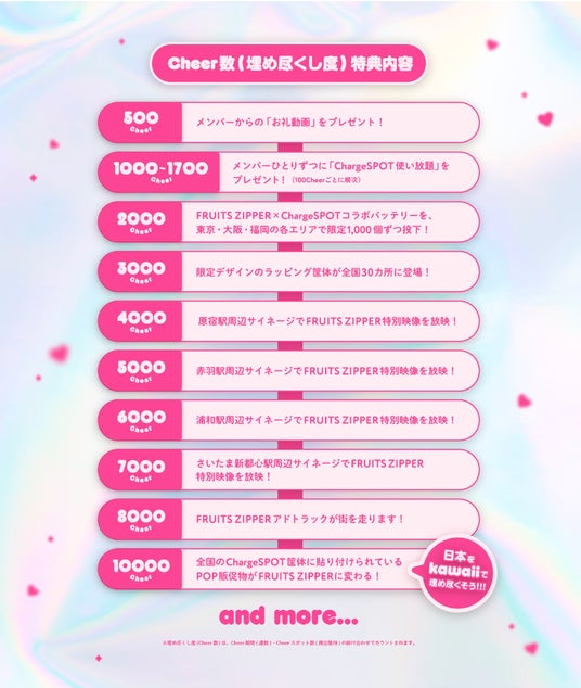 日本中に「FRUITS ZIPPER」の“KAWAIIパワー”を広げるプロジェクトです。「CheerSPOT」から「FURUITS ZIPPER」を応援することで、全国にある「ChargeSPOT」のデジタルサイネージを「FRUITS ZIPPER」の“Cheer(応援)”で埋め尽くします。