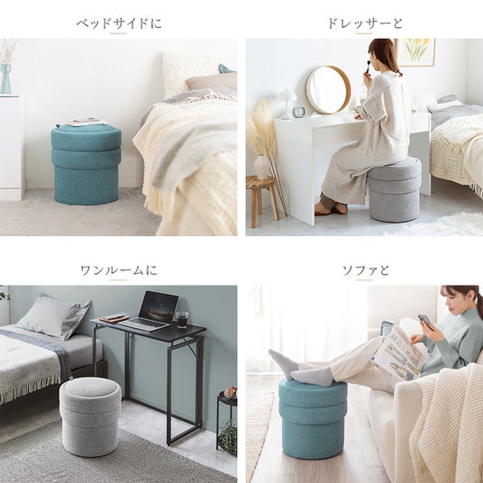 サッと座りたい場所に設置するスツールとして、ベッドサイドのちょい置きスペースにサイドテーブルとして、足を上げてリラックスするオットマンとして、3WAYで活用できるマルチ収納スツールです。