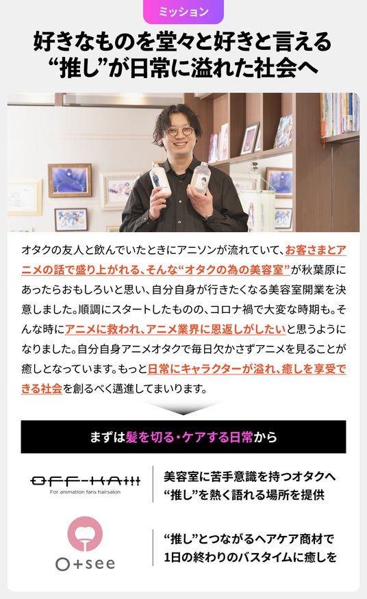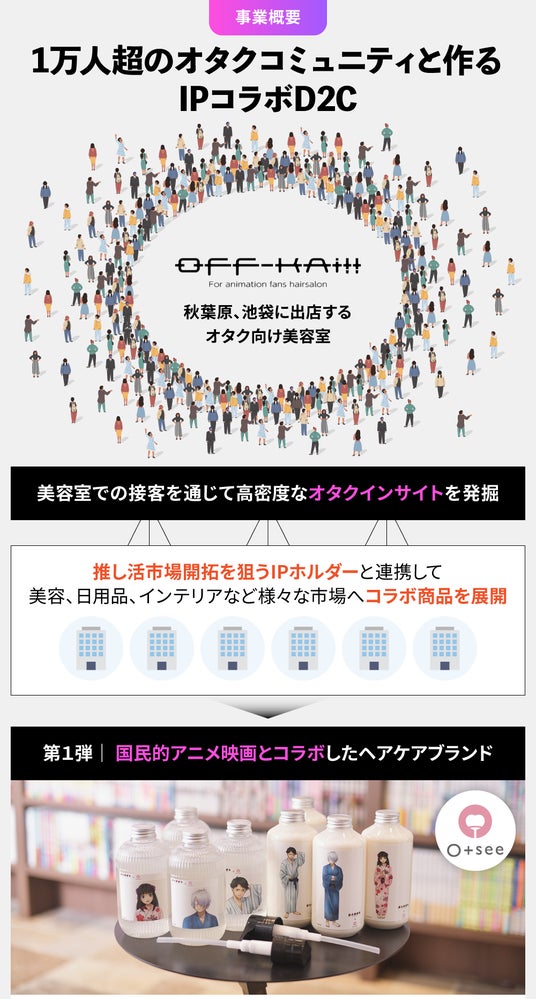 今回の資金調達は、「推しキャラと一緒に髪を洗う」という体験価値を提案する、高品質×キャラクターコラボのヘアケアシリーズ『O+see』のさらなる展開が目的です。