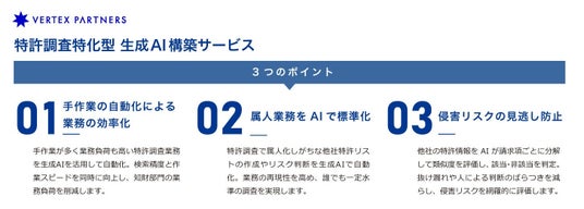 株式会社ベルテクス・パートナーズ(本社:東京都港区、代表取締役:山口正智)は、特許調査業務における業務負荷の大きさ、属人的スキルへの依存、他社特許抵触リスクといった構造的課題の解決を支援する「特許調査特化型 生成AI構築サービス」の提供を開始しました。
