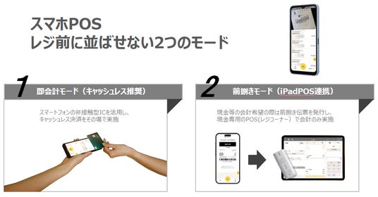 「スマホPOS」は、スマートフォン端末に小売向けサービス「POS+ retail」のPOS機能と、クレジットカードを始めとしたキャッシュレス決済端末の機能を搭載したサービスです。「即会計モード」では、レジに限らず店内のあらゆる場所で、商品のバーコードスキャン又は商品選択から登録、キャッシュレス決済まで一気通貫で決済に関する対応をすることが出来ます。「前捌きモード」では、催事やイベントなどでレジが混雑した場合に、事前に購入する商品の登録を済ませて伝票を発行し、会計のみをレジで行うことができます。レジの前の行列を緩和することができます。「スマホPOS」はこのように2つのモードによって、会計スペースの省スペース化はもちろん、店内で接客をしながら会計まで実施するなど、新しい店舗オペレーションを実現するサービスです。