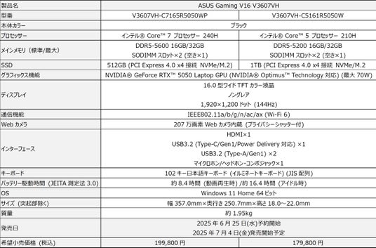 ※今回発表のASUS Gaming V16 V3607VHの詳細スペックはこちらからご確認ください。