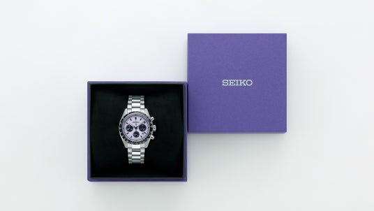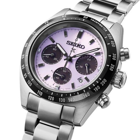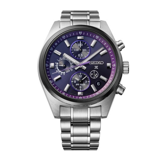 ソーラークロノグラフのモデルにも、大会メインカラーである「江戸紫」に着想を得たカラーリングを取り入れました。放射状の型打ちが施されたメインダイヤルに淡い紫色を配し、サブダイヤルとのコントラストを際立たせています。1972年に発表されたクロノグラフに採用された、視認性に優れるダイヤルを受け継ぎ、伝統に培われたデザインです。