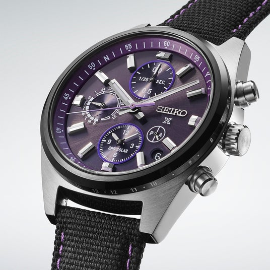 GPSソーラー デュアルタイム・クロノグラフのモデルは、ダイヤルリングやサブダイヤルの外周部、秒針に上品な紫色を使用しました。これは、東京2025世界陸上の大会メインカラーに選ばれた「江戸紫」に着想を得たカラーリングです。「江戸紫」は開催地の東京に縁のある日本の伝統色であり、競技会場の装飾をはじめ、大会を様々に彩ります。黒を基調としたダイヤルに、効果的に紫色を取り入れることで、高い視認性と個性のあるダイヤルが実現しました。また、紫色のステッチを施した再生ポリエステル素材のファブリックストラップが付属します。