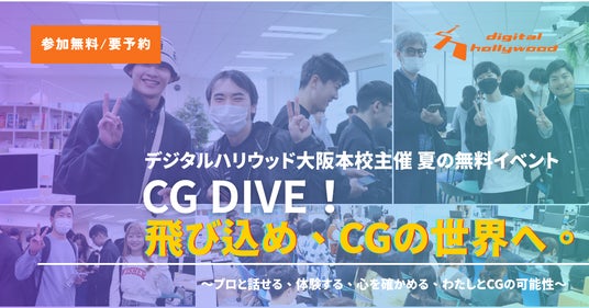 IT関連及びデジタルコンテンツの人材育成スクール[デジタルハリウッド] (運営会社:デジタルハリウッド株式会社、本社/本校:東京都千代田区、代表取締役社長兼CEO:春名啓紀、学長:杉山知之)の大阪本校では、CG・映像・ゲームなどクリエイティブ業界を目指す方に向けて、特別なCG無料体験イベント「CG DIVE!飛び込め、CGの世界へ。~プロと話せる、体験する、心を確かめる、わたしとCGの可能性~」を今夏に開催します。