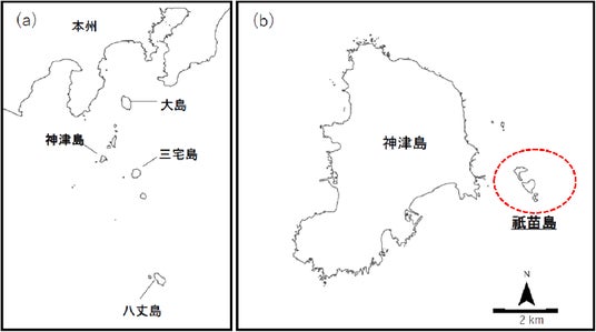 図1. 伊豆諸島神津島及び属島の祇苗島(赤い点線囲み部分)