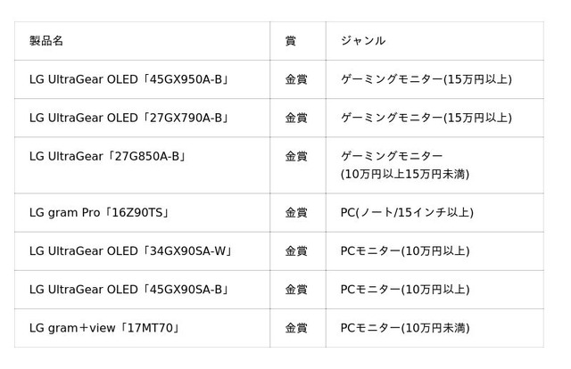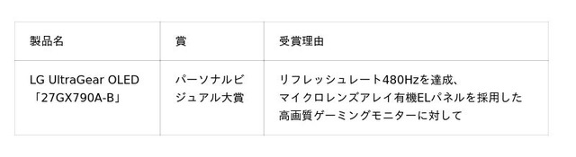 LGエレクトロニクス・ジャパン株式会社(代表取締役:孫 成周(ソン・ソンジュウ)、本社:東京都中央区)は、株式会社音元出版が主催するオーディオ&ビジュアル機器の総合アワード「VGP2025 SUMMER」において、有機EL採用26.5インチゲーミングモニター「LG UltraGear OLED 27GX790A-B」がパーソナルビジュアル大賞を、モニターやモバイルノートパソコンなど計7製品が金賞を受賞しましたので、お知らせします。