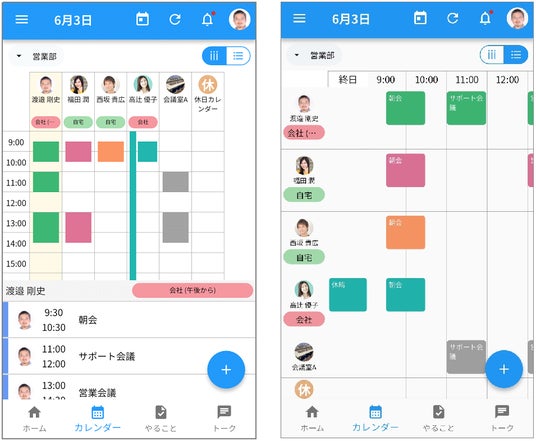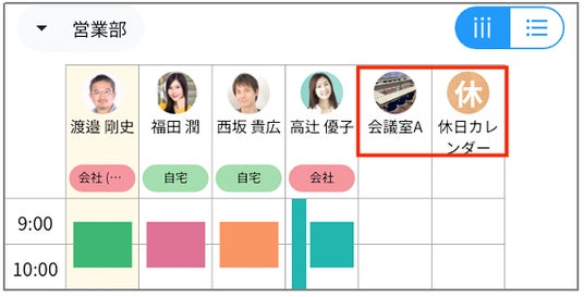 カレンダーの「みんなの予定」画面で、ユーザーを従来の縦並びから横並びに変更できるようになりました。これにより各ユーザーの予定が縦長に表示されるため、それぞれの予定や働く場所、そして施設の予定を一度に確認しやすくなります。