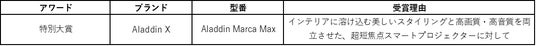 さらに本年は、映像音響部会の特別賞にて、「Aladdin Marca Max」がインテリアに溶け込む美しいスタイリングと高画質・高音質を両立させた超短焦点スマートプロジェクターとして評価され、特別大賞も受賞しています。
