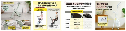 2018年のブランド展開開始から、SNSやカスタマーサポートで既存製品に対するお客様の声を拾い上げ、日本人の体格や考え方、住環境、ライフスタイルに配慮したホームフィットネス / ストレッチ製品を提案し、日本においてトップクラスのEC販売実績を誇るステディジャパン株式会社(本社:東京都新宿区、代表取締役CEO : 森 由樹)は、ブランド展開当初からロングセラー製品である「STEADY フィットネスバイク」の新色グリーンを、2025年6月25日(水)よりSTEADY公式サイト、総合オンラインストアAmazon.co.jp、楽天市場などにて発売します。