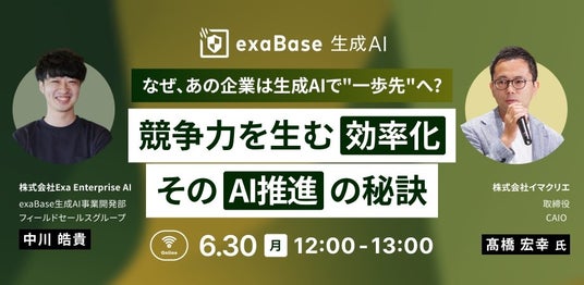 株式会社イマクリエ(本社:東京都港区、代表取締役:鈴木 信吾、以下、当社)は、2025年6月30日(月)に開催される生成AIセミナーに、取締役 CAIO 高橋 宏幸が登壇することをお知らせします。本セミナーは、株式会社エクサウィザーズ(東京都港区、代表取締役:春田 真、以下、エクサウィザーズ)が主催するものです。