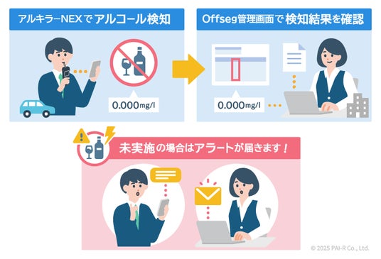株式会社パイ・アール(本社:大阪市中央区、代表取締役:安田 功)は、2023年12月よりアルコールチェック管理システム「アルキラーNEX」と株式会社デンソーテン(本社:兵庫県神戸市、代表取締役社長:米本 宜司)の安全運転管理テレマティクスサービス「Offseg」とのアルコール検知データの連携を行ってまいりました。このたび、さらなる連携強化として、アルコールチェック未実施時のアラート機能を実装いたしました。