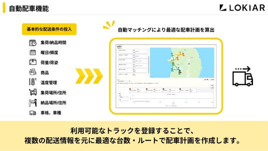 株式会社LOKIAR(本社:東京都北区、代表取締役:伊藤 健太、以下「弊社」)は、物流管理サービス『Meech』において、配送業務で最適な配車手配とルート設定を自動化する新機能「自動配車機能」を提供開始したことをお知らせいたします。