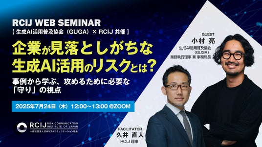 日本で唯一のコミュニケーション戦略におけるリスク管理に特化したカリキュラムを展開する一般社団法人 日本リスクコミュニケーション協会(略称:RCIJ、代表理事:大杉春子)は、2025年7月24日(木)に無料ウェビナー『企業が見落としがちな生成AI活用のリスクとは?事例から学ぶ、攻めるために必要な「守り」の視点』を開催いたします。