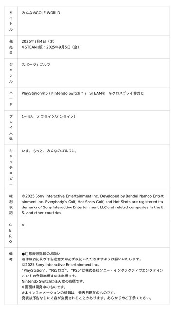 1997年にPlayStation(R)で発売され、誰でも爽快なゴルフを楽しめるゲームとして愛され続けてきたゴルフゲームシリーズ『みんなのGOLF』の最新作「みんなのGOLF WORLD」は、PlayStation(R)5/Nintendo Switch(TM)にて9月4日(木)、STEAM(R)にて9月5日(金)に発売いたします。