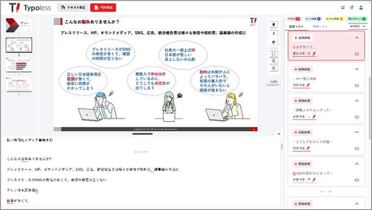 株式会社朝日新聞社(代表取締役社長:角田 克)の文章校正AI「Typoless(タイポレス)」でご利用いただけるPDFファイルの校正機能がバージョンアップしました。PDFから文字を読み取るAIエンジンを刷新し、文章の認識精度が向上しました。これにより、縦書きの文章や複数行にまたがる文章のかたまりをより正確に認識できるようになりました。PDFファイルの校正機能はエンタープライズ+Plusプラン、プレミアム+Plusプランでご利用可能です。Typolessは国際認証「ISO/IEC27001:2022」を取得しており、安全な環境でPDFファイルの校正が可能です。