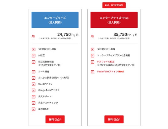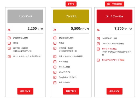 法人向けプランは30日間の無料トライアルが可能で、通常料金から15%OFFのお得な年払いにも対応しています。個人向けプラン、API連携プランは14日間の無料トライアルを実施しています。今後も文章校正や情報発信にかかわる業務効率改善、誤植や不適切表現に起因するブランド毀損や炎上などのリスクマネジメントに貢献するため、さらなる機能・サービスの向上に取り組んでまいります。