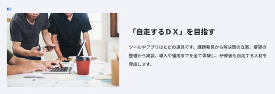 ツールやアプリはただの道具です。課題発見から解決策の立案、要望の整理から実装、導入や運用までを全て体験し、研修後も自走する人材を育成します。