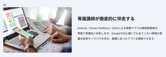 kintone / Power Platform / Clickによる実務アプリの開発経験者が、専属で受講生に伴走します。GoogleやAIに聞いても出てこない現場の貴重な知見やノウハウを学び、業務にあったアプリを開発できます。