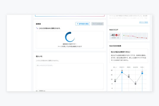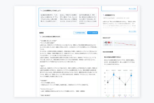 NALYSYSは、モチベーションサーベイ「NALY」を通じて、メンバーのコンディション変化を可視化してきました。しかし、可視化された情報をもとに「どのように声をかけ、どのような面談をすべきか」と悩むマネージャーは少なくありません。こうした課題を受け、面談の準備から記録、フォローアップまでを一貫してAIが支援する「AIマネジメントサポート」機能を開発しました。■主要機能について