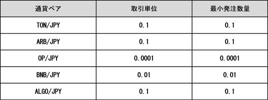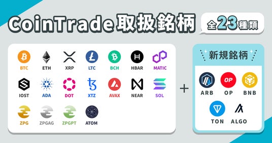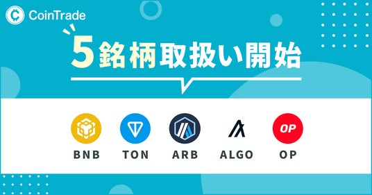 当社の提供するサービス「CoinTrade(コイントレード)」において、本日取扱い開始となるビルドアンドビルド(BNB)、トンコイン(TON)、アービトラム(ARB)、アルゴランド(ALGO)、オプティミズム(OP)の5銘柄加え、23銘柄の取扱いとなりました。