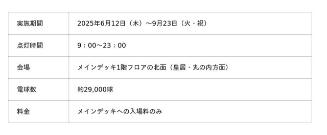 無数のLED電球を夜空に瞬く「天の川」に見立て、涼しげな光で夏の風情を演出する恒例の「天の川イルミネーション」。メインデッキで夜景とイルミネーションの競演がお楽しみいただけます。
