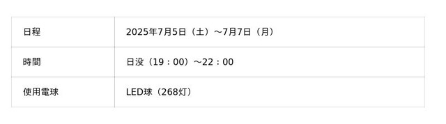 7月5日(土)~7日(月)の3日間限定で、特別ライトアップ「七夕インフィニティ・ダイヤモンドヴェール」を日没(19:00)~22時まで、点灯します。塔体に設置された268台のLEDライト1つ1つの光が、じんわりと明滅し、天の川のように、揺らめくライトアップをお楽しみいただけます。