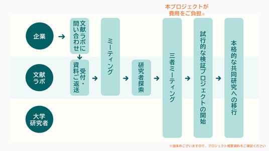 本プロジェクトでは、大学の論文をもとに着想した事業‧技術アイデアが、企業に提示されます。そのアイデアをたたき台として、企業と文献ラボが議論を重ね、企業が取り組みたい研究開発の方向性を具体化します。そのうえで、内容に応じた研究者とのミーティング調整や、産学連携組成の支援を行います。本格的な共同研究に移行する前の、小規模な研究費用(初期費用:大学の学術指導料、研究成果有体物契約、共同研究で小規模なもの)を、本プロジェクトが負担します。