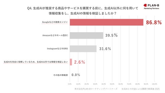 生成AIをきっかけに購買・行き先決定の経験がある人を対象に「Q4. 生成AIが推奨する商品やサービスを購買する前に、何を用いて情報を検証しましたか?」と質問したところ、「Googleなどの検索エンジン」が86.8%で圧倒的多数となりました。次いで「Amazonなどのモール型EC」(39.5%)、「InstagramなどのSNS」(31.6%)と続きました。一方で、「生成AIを完全に信頼しているため、検証しない」と回答した人はわずか2.6%でした。