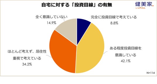 「自宅を『投資目線』で考えているか」を尋ねたところ、「ある程度投資目線を意識している」が42.1%となり、 「完全に投資目線で考えている」8.8% と合わせると50.9%と半数程度となりました。一方、「ほとんど考えず、居住性重視で考えている」も34.2%に上りました。