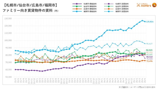 また、福岡市が125,814円で前年同月比110.8%と、シングル向き同様に高い上昇率となっており、地方4市では頭一つ抜けています。しかし、反響賃料は95,617円で前年同月比99.3%となっており、物価高などを背景にユーザーの需要は追随していません。