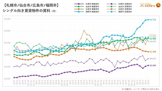また、地方4市(札幌市、仙台市、広島市、福岡市)では福岡市が64,716円で前年同月比111.2%と、全国的にもひと際高い上昇率を記録しています。