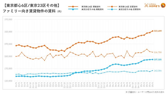 ファミリー向き賃貸物件の平均掲載賃料は、首都圏で137,794円(前年同月比104.8%)、近畿圏で86,373円(前年同月比103.3%)となり、いずれも過去最高賃料を記録した前月に次ぐ高さとなりました。首都圏では東京23区のうち都心6区(千代田区、港区、中央区、新宿区、渋谷区、文京区)を除いた「23区その他」(207,305円・前年同月比110.6%)、近畿圏では大阪市のうち中心6区(中央区、北区、西区、福島区、天王寺区、浪速区)を除いた「大阪市その他区」(97,388円・前年同月比113.5%)で、特に高い上昇率となり、都心の周縁部が賃料上昇を牽引しています。