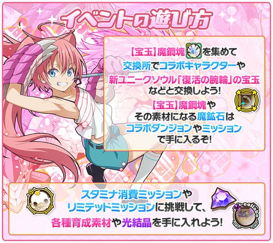 本イベントは、『転スラ』のコラボガチャやコラボダンジョンが登場する他、コラボログインボーナス、さまざまなミッション、交換所、アニメ出演声優さんたちのサイン色紙などが当たるキャンペーンなど、盛りだくさんの内容でお届けします。