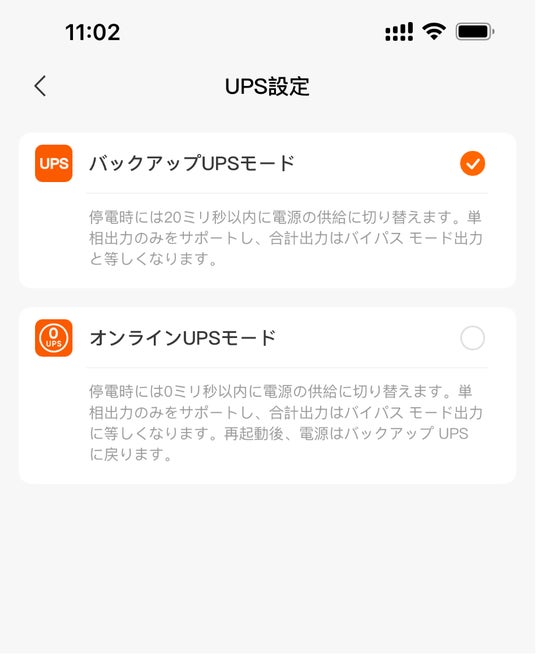 アプリで「オンライン UPS」モードを設定すると、停電が発生しても0秒以内にポータブル電源側からの給電に自動で切り替えます。