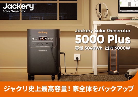 ポータブル電源・ソーラーパネルの世界的リーディングカンパニーJackery (ジャクリ)の日本法人である株式会社Jackery Japan(本社:東京都中央区)は、2025年6月30日(月)よりJackery史上最大容量の「Jackery ポータブル電源 5000 Plus」を販売開始いたします。5040Whの超大容量と定格出力6000Wの高出力を実現し、最大5台の拡張バッテリー(5040Wh)に対応することで、最大30,240Whまで拡張可能です。工事が不要で、タイヤ付きなので、日常使いや災害時の非常用電源として、様々な場所で手軽に使えます。