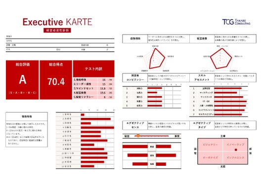「Executive KARTE(経営者適性診断)」では、経営者・後継者・執行役員クラス以上の経営幹部およびその候補者を対象として全265問のアンケートを実施。個人の性格特性を測る「性格テスト」と、幹部としての適性を測る「適性テスト」、経営者としての知識・素養を測る「経営素養」などの結果をそれぞれ数値化することで、自分自身の特性を客観的かつ体系的に把握できます。結果はレーダーチャートと得点で表示され、自分自身では認識しづらい適性傾向やコンピテンシー、判断基準、経営者としてのタイプなどを分析することで、自身の現状の課題や潜在的なストロングポイント、今後強化すべき能力などが一目で明確になります。次期経営者・後継者・経営幹部候補の選定、個別育成計画、自己啓発まで、データに基づいた企業の経営体制づくりを科学的に支援いたします。