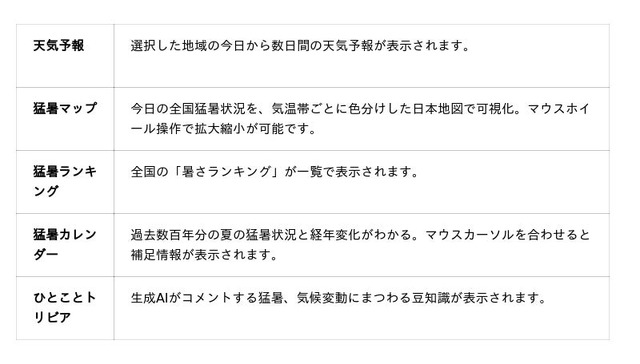 猛暑ボードは、気象庁のデータをもとに、日本の夏の猛暑を「現在・過去・未来」で可視化するダッシュボードです。多くの方が気温データを直感的に理解でき、気候変動への気づきを促すことを目指したデジタルプラットフォームです。