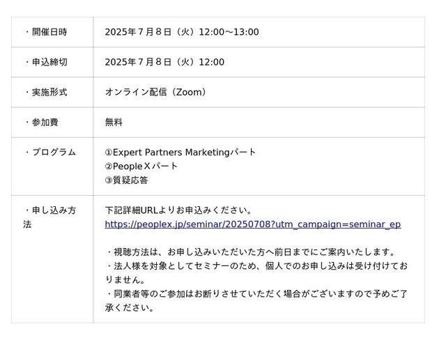株式会社TWOSTONE&Sonsの100%子会社である株式会社Digital Arrow Partners(所在地:東京都渋谷区、代表取締役CEO:道家康貴、以下 Digital Arrow Partners)は、2025年7月8日(火)に株式会社PeopleX(本社:東京都新宿区、代表取締役CEO:橘大地、以下 PeopleX)と共催でウェビナーを開催することをお知らせいたします。