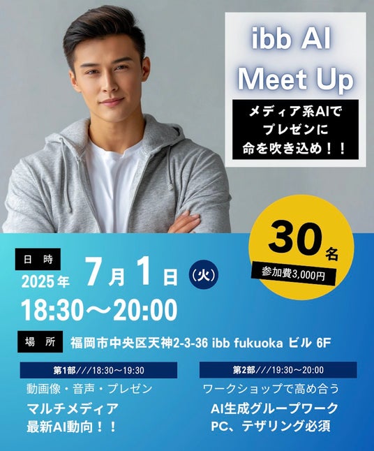 株式会社トルビズオン(福岡市中央区、代表取締役:増本 衞、以下「トルビズオン」)は、起業IPO支援施設「ibb fukuoka」と連携し、2025年7月1日(火)、福岡市中央区天神2-3-36 ibb fukuokaビル6Fにて、生成AIに特化した勉強会「ibb AI Meet Up」を開催いたします。本イベントは一般参加枠は満席となりましたが、メディア取材は引き続き特別枠で受付中です。