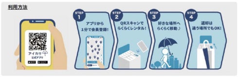 アプリから会員登録 → レンタルスポットで二次元コードをスキャン → 傘をレンタル