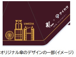 阪急沿線でのサービス展開に際して、阪急電車をイメージしたオリジナル傘を合計300本制作します。阪急電車の車体色であるマルーンカラーをベースに主要ターミナルである大阪梅田、神戸三宮、宝塚、京都河原町の街並みをデザインし、線路に見立てた線で結ぶことで、気軽にお出かけいただける魅力的なスポットが沿線に存在していることを表現しています。