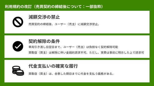 - 車両の引き渡し日の翌日までは、ユーザー(売主)が買取店(買主)に対して通知することにより、何らの負担なく売買契約を解除できるようにするものとする。