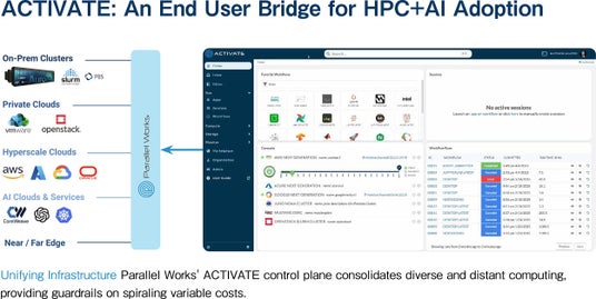 Parallel Works社の「ACTIVATE」は、オンプレミス環境とクラウド環境をシームレスにプロビジョニング、管理、共有し、高度なコスト管理と予算管理機能を備えた大規模なコンピュートリソースをチームに提供する、ハイブリッドマルチクラウドコンピューティングの革新的なコントロールプレーンです。「ACTIVATE」は、直感的なインターフェイスとAPI主導のプロセスにより共同研究を促進し、生産性を向上させ、複雑なエンタープライズコンピューティング環境のオペレーティングシステムを実現します。