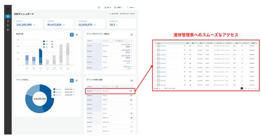 - ブランド別・組織別・担当者別・取引先別など多軸での可視化により、KPI(売上金額・粗利金額・達成率)をリアルタイムに把握可能