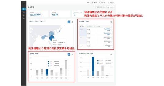 - 発注情報とサプライヤー情報から月別の支払い予定を可視化。予算に対する支出の進捗を管理することで、資金繰りやキャッシュフローの見通しを支援。