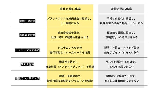 多くの企業で起きている課題の根っこには、「従来の線形的な戦略設計」「予測可能な市場前提の事業設計」「短期的な危機対応力の不足」といった"脆弱な経営体質"にまつわる問題があります。