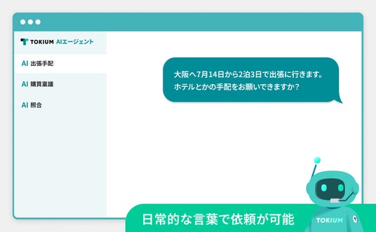「TOKIUM AI出張手配」は、日常的な言葉でチャット形式で依頼するだけで、最適な移動ルートやホテルの提案、出張の事前申請の作成までを一貫してAIエージェントが実行するサービスです。さらに、AIがプロスタッフと連携し、申請に基づいて予約まで完了できます。