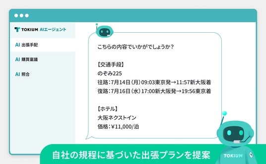 TOKIUM上での事前申請と事後精算の自動連携や個人のカレンダー情報から出張を予測してAIが自律的に手配を提案する機能などの開発を進めています。また、APIを介して、TOKIUM以外の多様なサービス上でも「TOKIUM AI出張手配」を使用できる開発も行ってまいります。